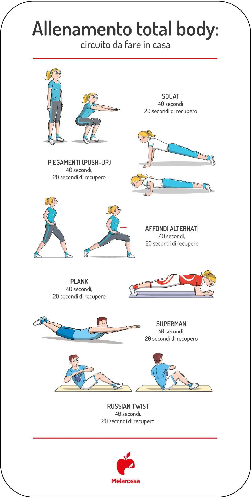 • Squat: 40 secondi, 20 secondi di recupero (Schiena dritta, peso sui talloni).
