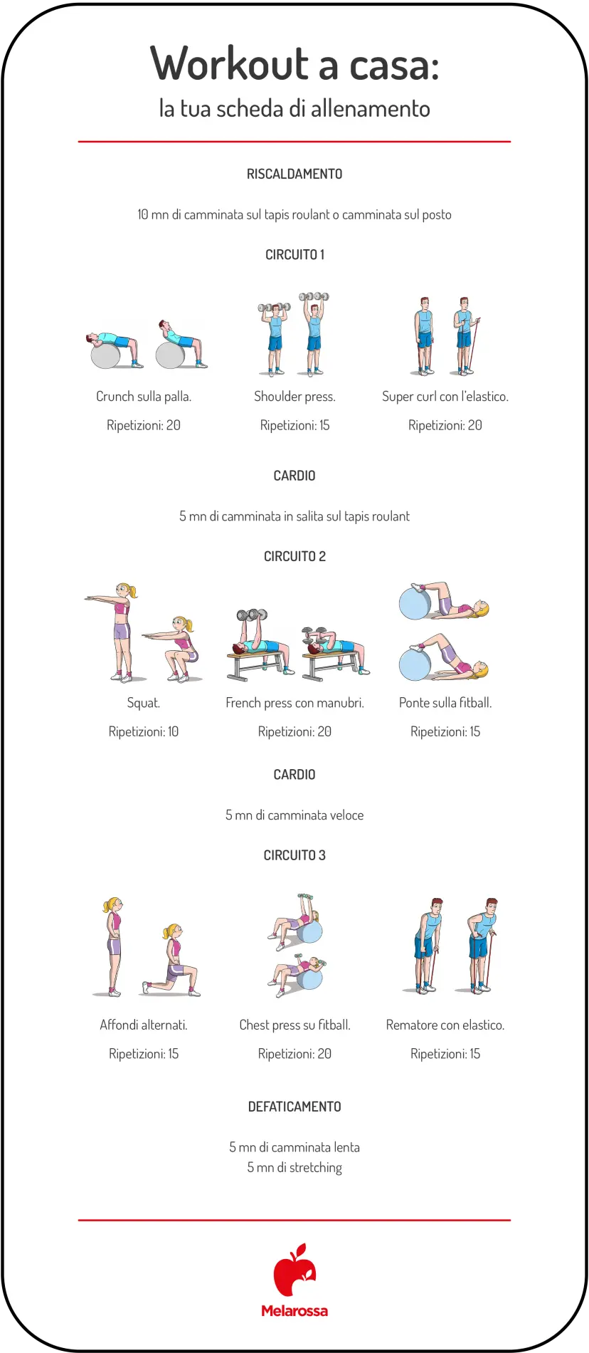 Il workout a casa va fatto 3 volte a settimana. Se non sei allenato, nella prima settimana di allenamento ripeti i circuiti una sola volta.