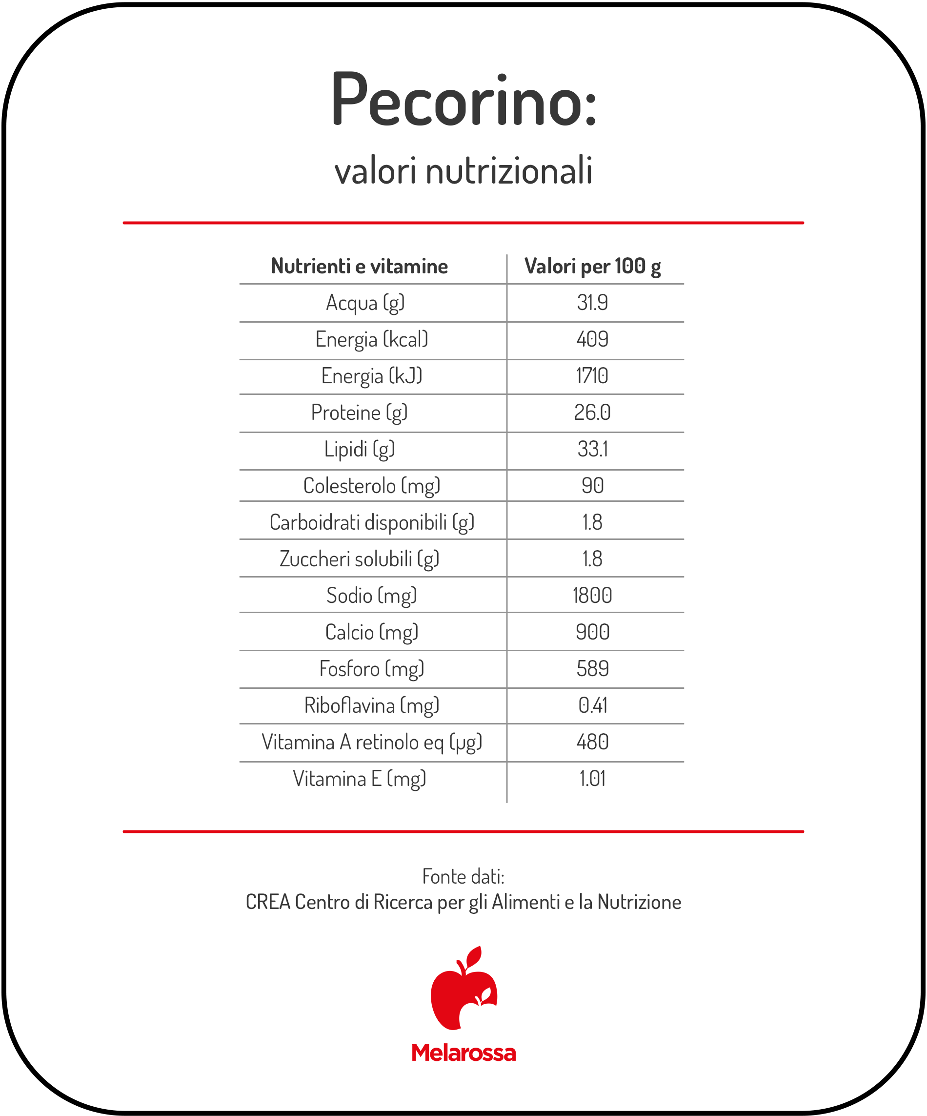 Rispetto ai vaccini, come il Parmigiano Reggiano o il Grana Padano, il pecorino ha una quantità maggiore di grassi (soprattutto quando stagionato per lunghi periodi), ma anche più calcio e zinco.