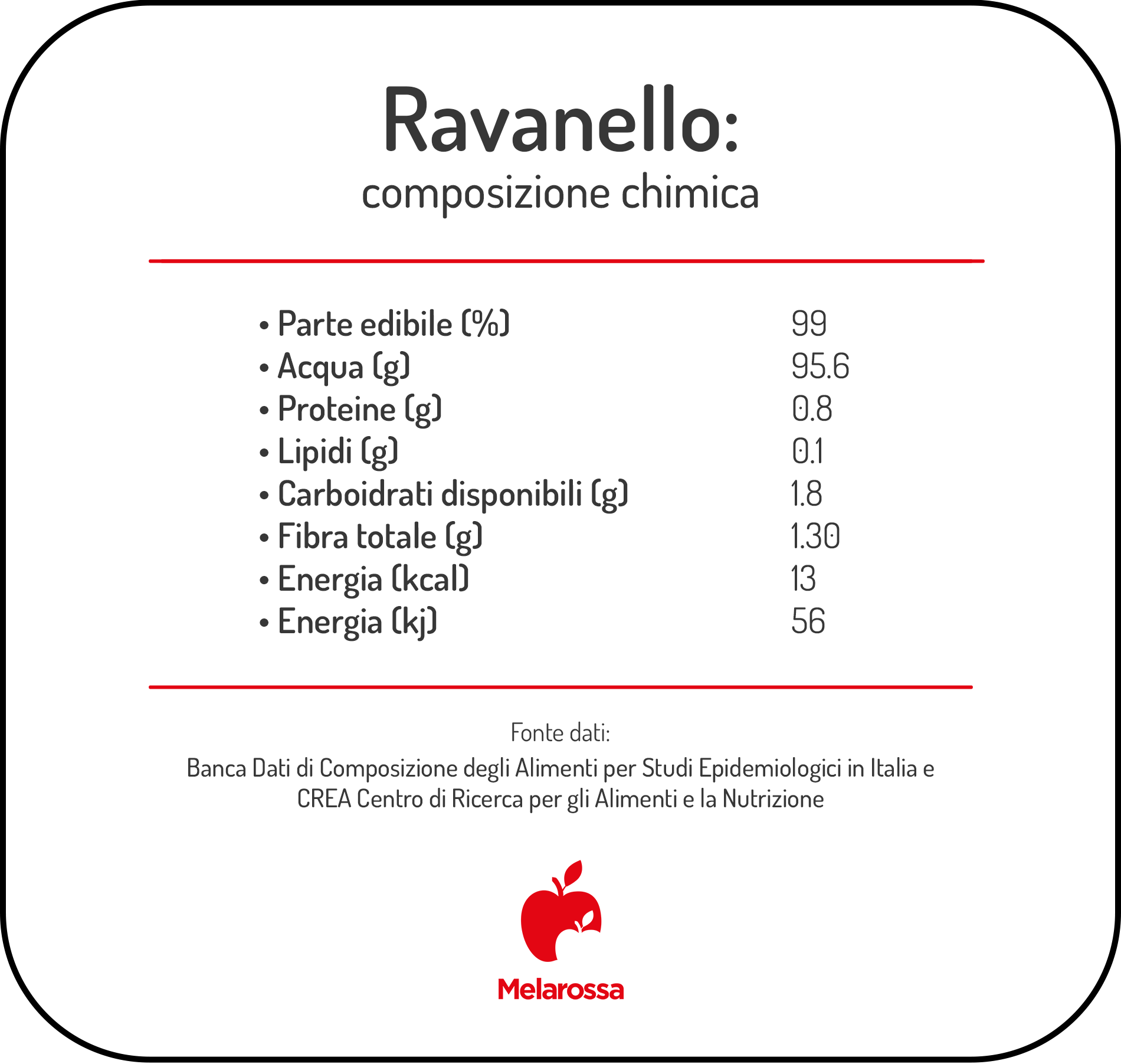 Il ravanello fornisce un gran apporto di acqua, essendone costituito per il 95% del suo peso. Inoltre, presenta un buon contenuto di fibra, soprattutto fibra insolubile. Queste caratteristiche lo rendono ideale per essere consumato come snack in qualsiasi momento della giornata.
