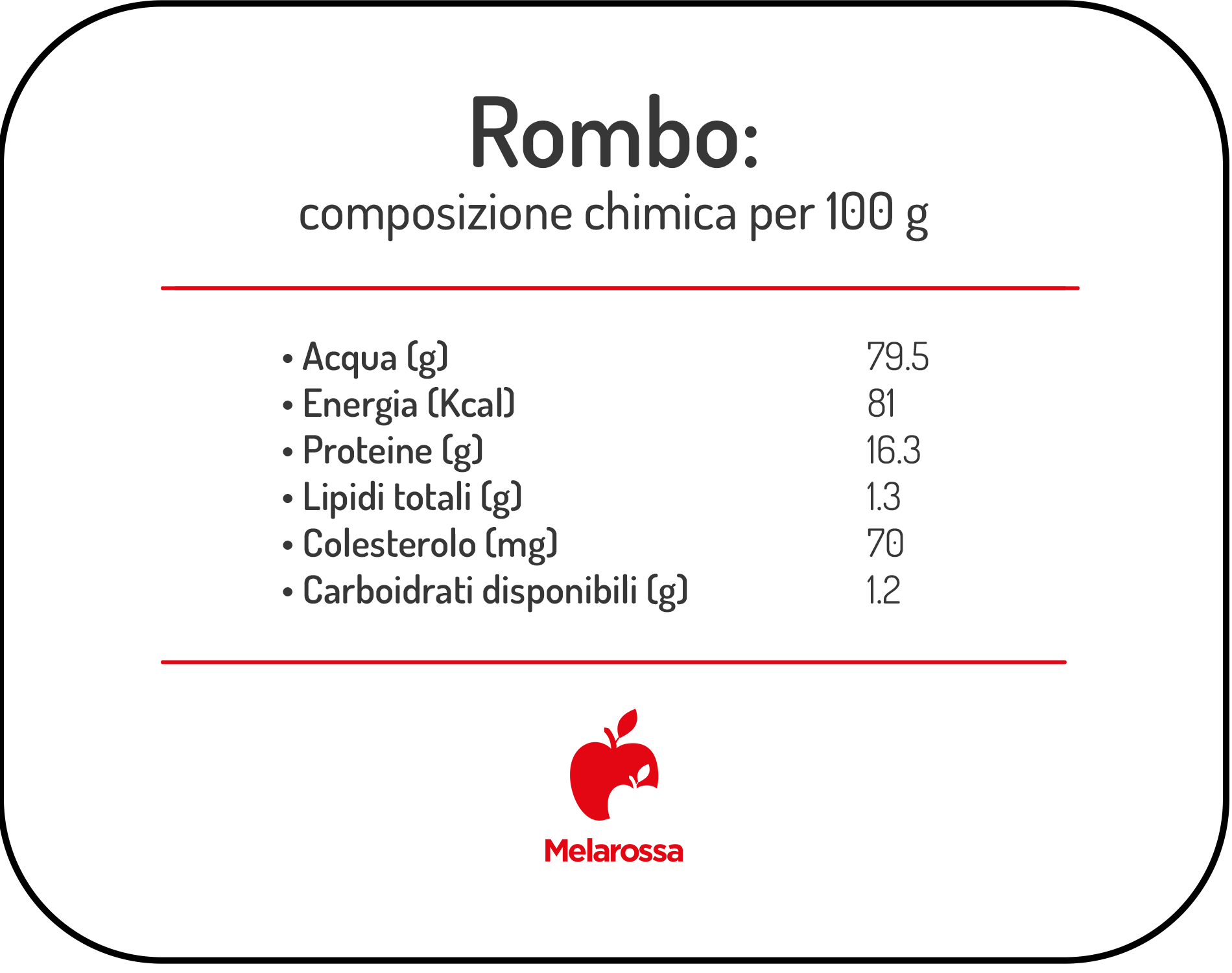 grafica  dei nutrienti e calorie del rombo con  logo Melarossa e fonti