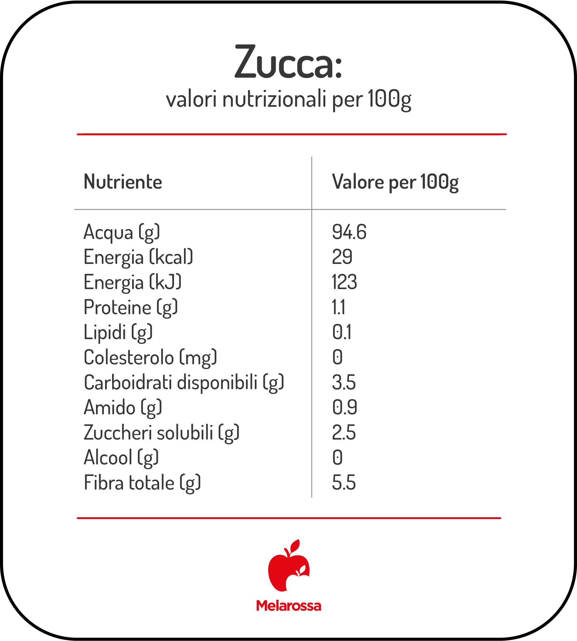 Grafica che  elenca calorie e  valori nutrizionali della zucca  con logo Melarossa