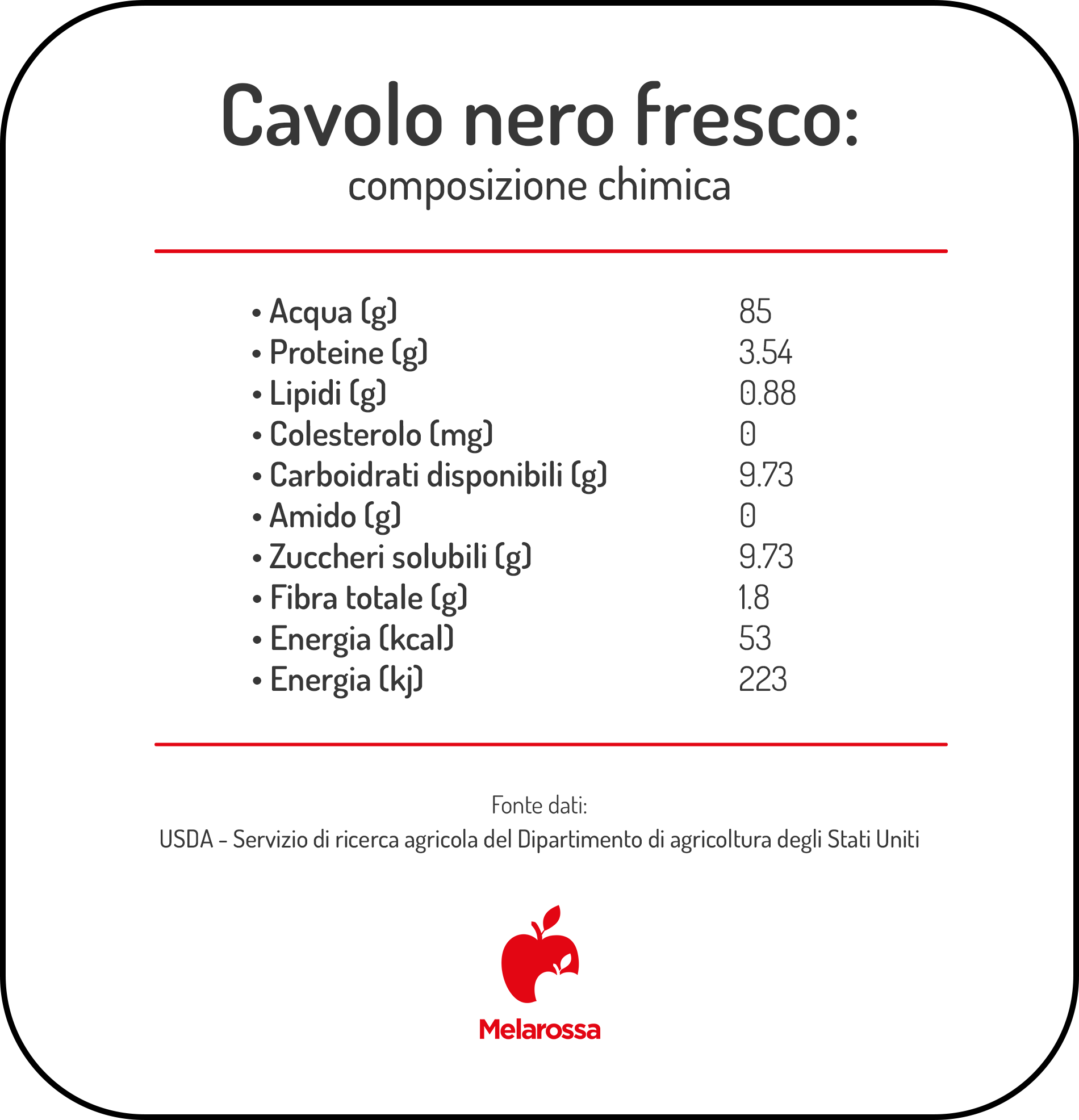 Il cavolo nero (Brassica oleracea var. sabellica) appartiene alla famiglia delle Brassicaceae, come cavolfiore e verza. È originario delle regioni del Mediterraneo e cresce spontaneamente nei mesi freddi, tra novembre e febbraio, con il periodo migliore tra dicembre e gennaio, quando le gelate rendono le foglie più dolci e tenere.
