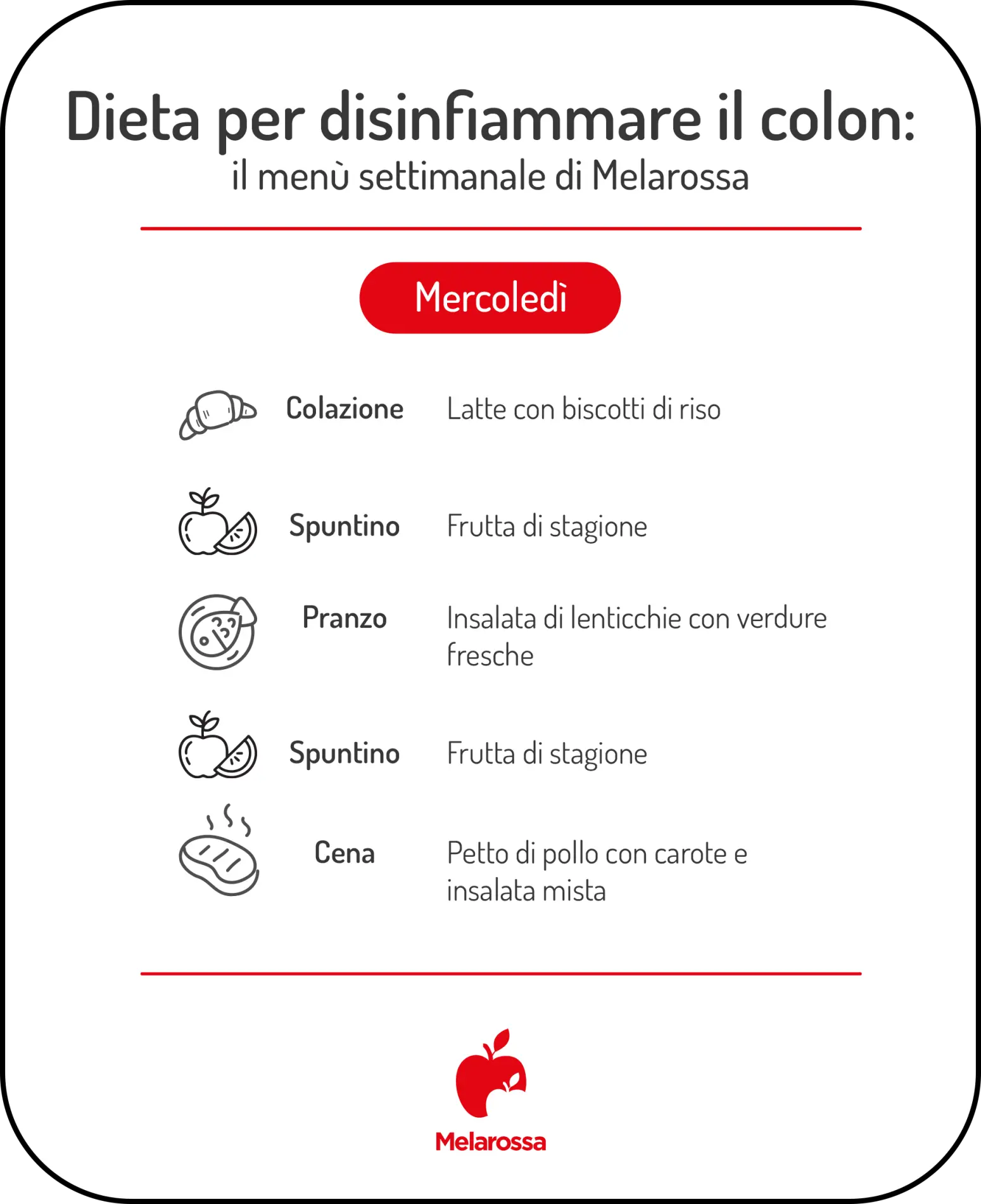| Cena | Petto di pollo con carote e insalata mista |